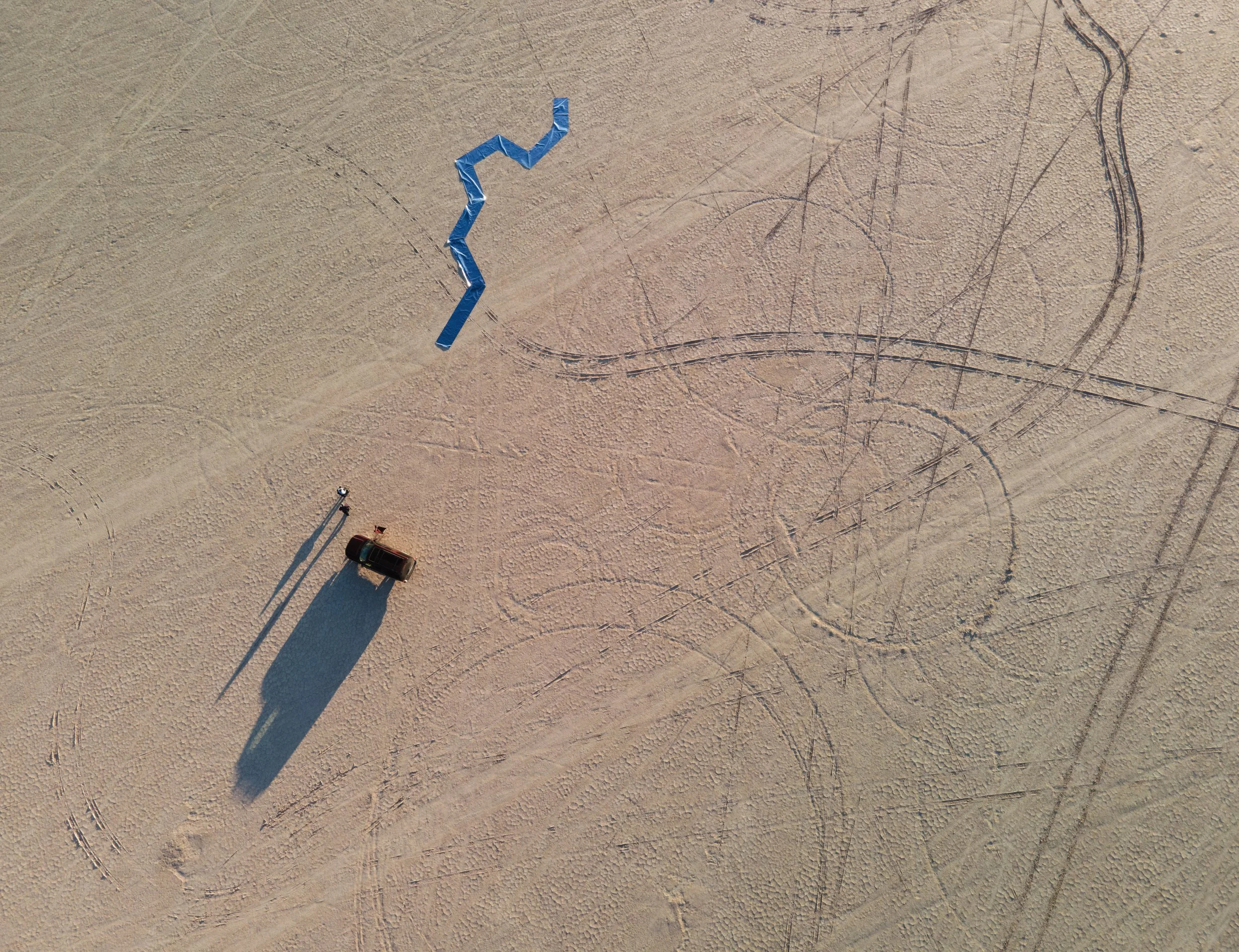 The images I created are from a series of attempts to ‘go large’ in the vein of Heizer’s Rift without the impact on the environment. The art pieces I created encompass a variety of materials, from spray-painted cardboard to aluminum insulation and landscape cloth. I increased the scale through trial and error, eventually making a 180-foot line. After taking photographs via a drone, I removed all materials.